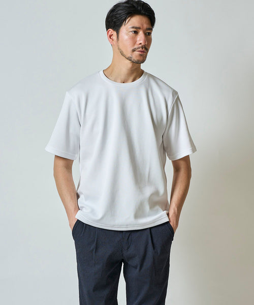 麻のような涼しさとドライタッチを備えた、ストライプ織り柄入りの高機能カット素材を使用。
